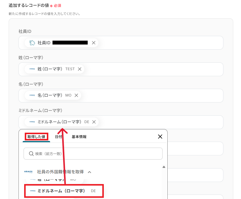 取得した社員IDを基に、外国籍情報を取得する設定を行います。