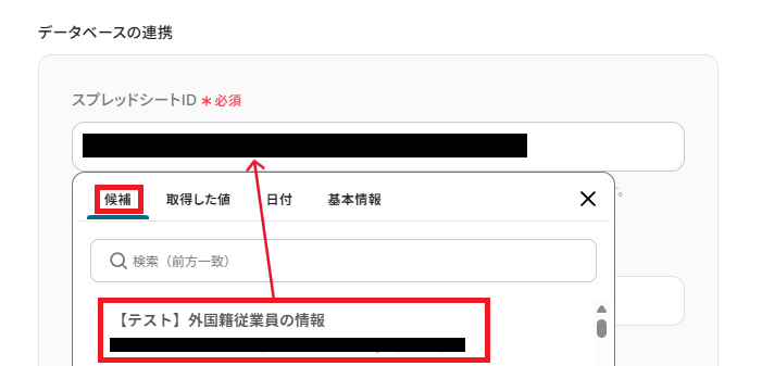 「スプレッドシートID」と「スプレッドシートのタブ名」は、入力欄をクリックして表示される候補から作成した記録用シートを選択してください。
