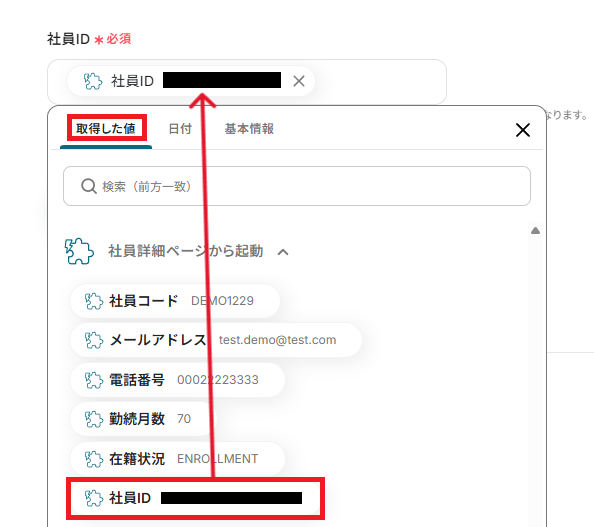 「社員ID」は、取得した値を引用し設定しましょう。