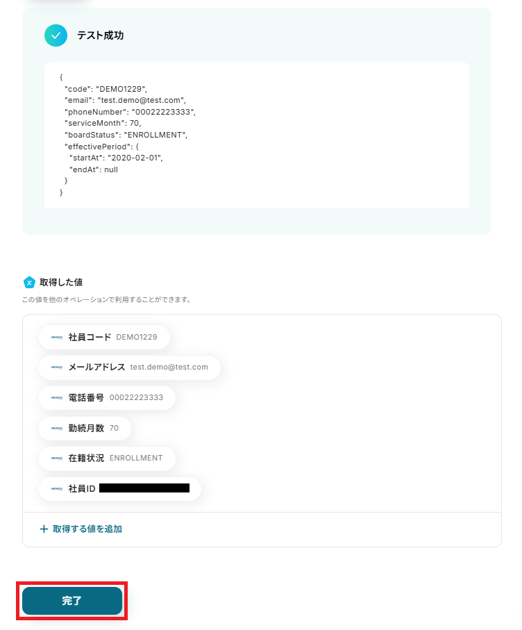確認できたら、Yoomに戻り「完了」を押してください。