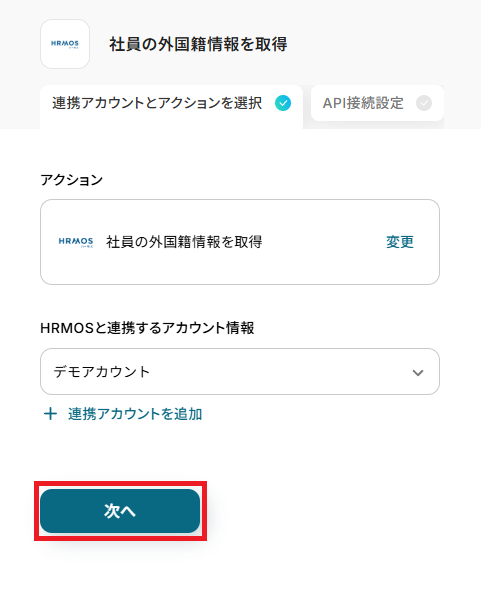 再度、Yoomと連携するHRMOSのアカウントに間違いがないかを確認し「次へ」をクリックしましょう。