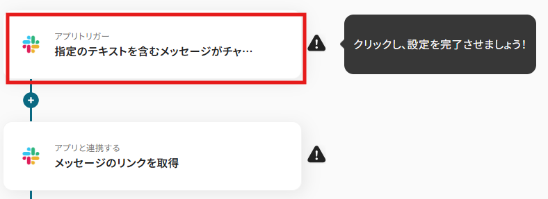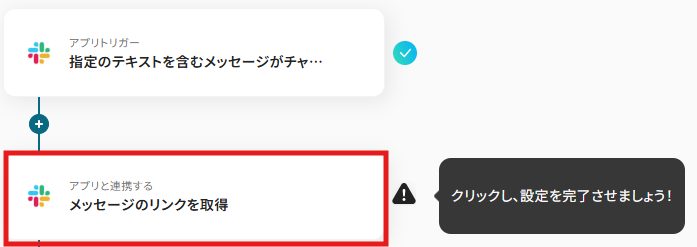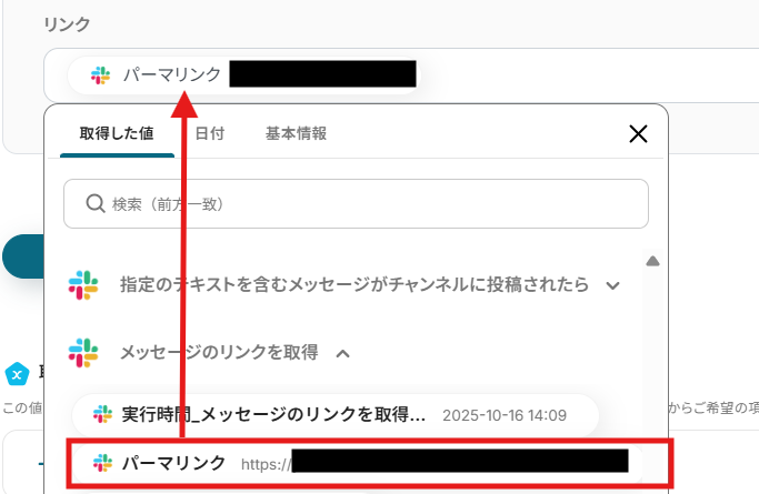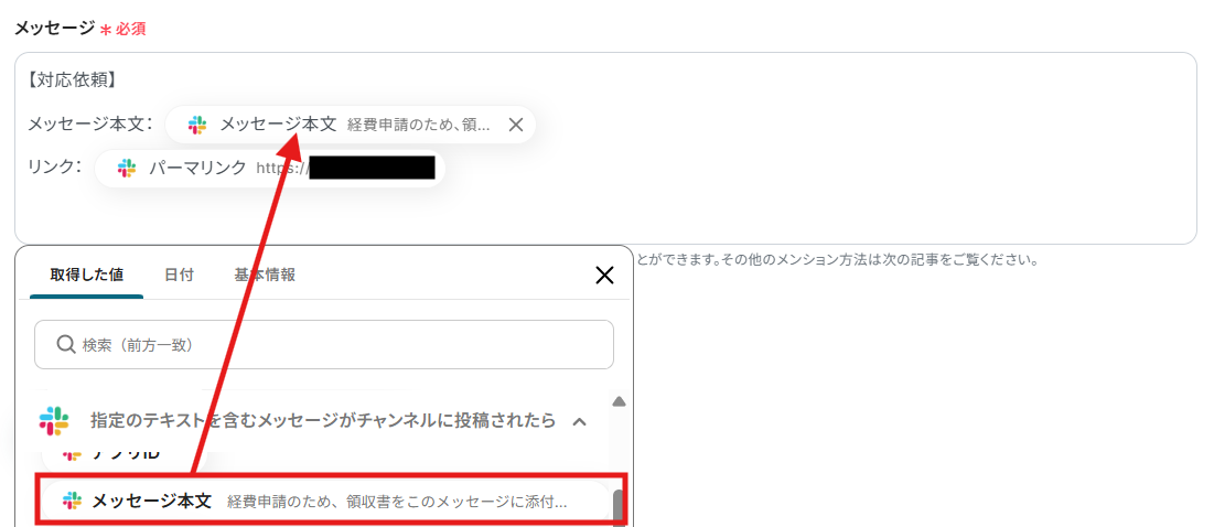 テキストボックスをクリックして、「指定のテキストを含むメッセージがチャンネルに投稿されたら」や「メッセージのリンクを取得」からSlackの情報を引用できます!
