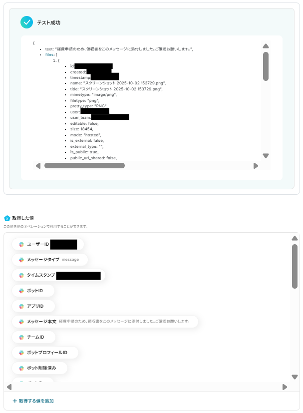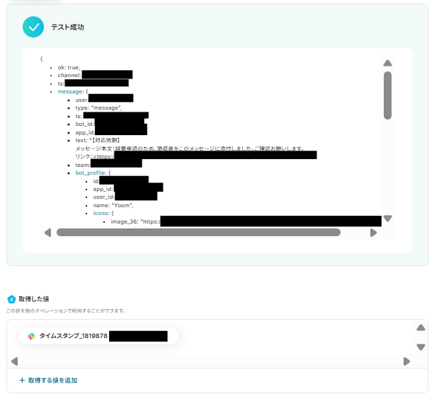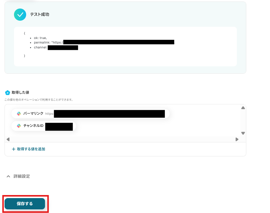 テストに成功すると取得した値の横に、Slackに送信したメッセージの詳細情報が表示されます。「保存する」をクリックして完了です!