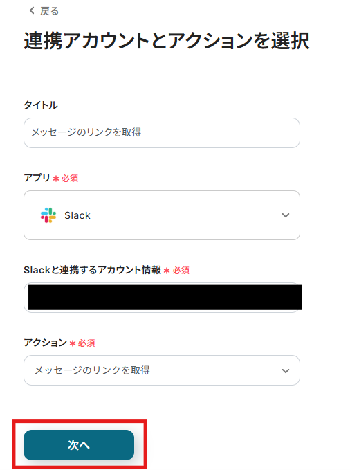 こちらも、ステップ1でマイアプリ連携したSlackのアカウント情報が自動で表示されます。