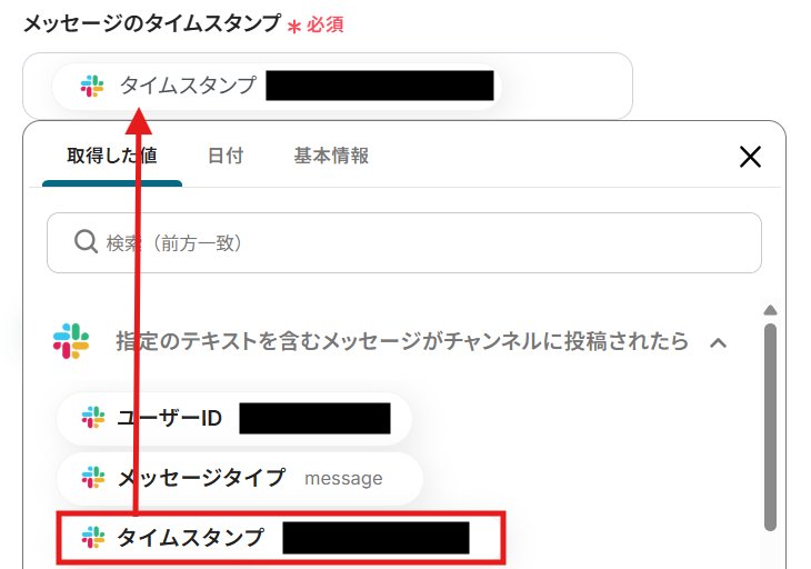 編集欄をクリックして、「指定のテキストを含むメッセージがチャンネルに投稿されたら」からタイムスタンプを選択してください。