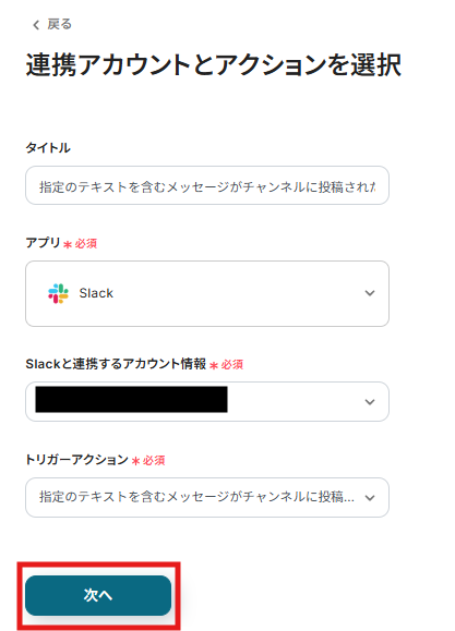 トリガーアクションは、「特定のテキストを含むメッセージがチャンネルに投稿されたら」のままで次に進みましょう!