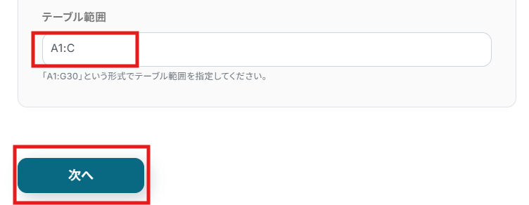 更新したいデータが記載されているテーブル範囲を任意で入力し、「次へ」をクリックします。