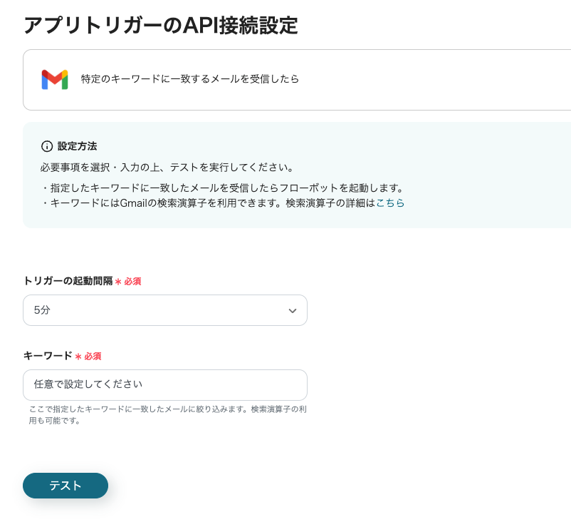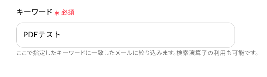 ステップ3:アプリトリガー「特定のキーワードに一致するメールを受信したら」