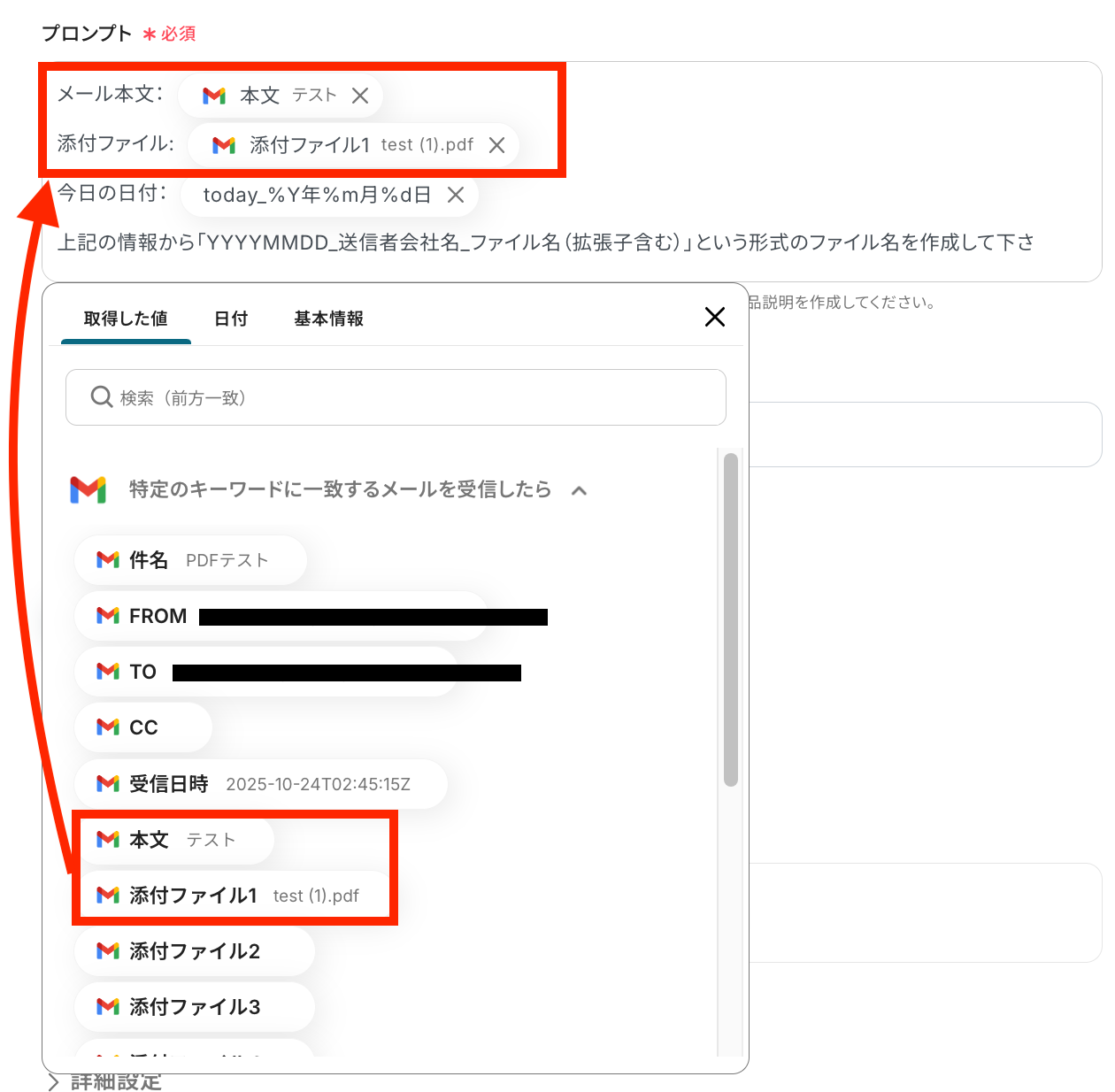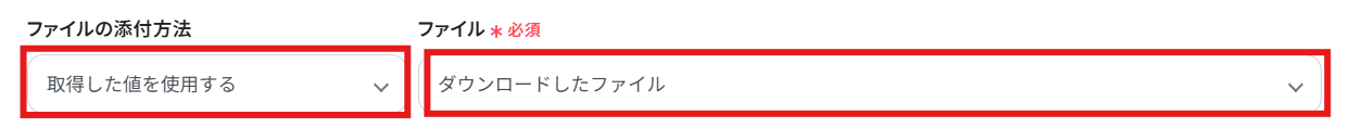 「ファイルの添付方法」が「取得した値を使用する」に、「ファイル」が「ダウンロードしたファイル」に設定されていることを確認します。