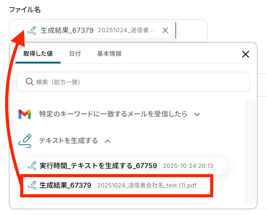 「ファイル名」を「取得した値」から設定しましょう。