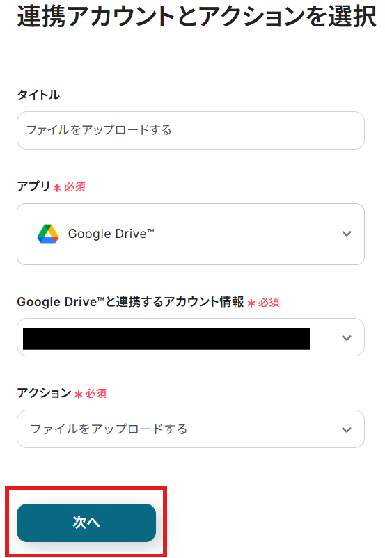 タイトルと連携するアカウント情報を確認し、アクションはテンプレート通りのまま「次へ」をクリックして進んでください。