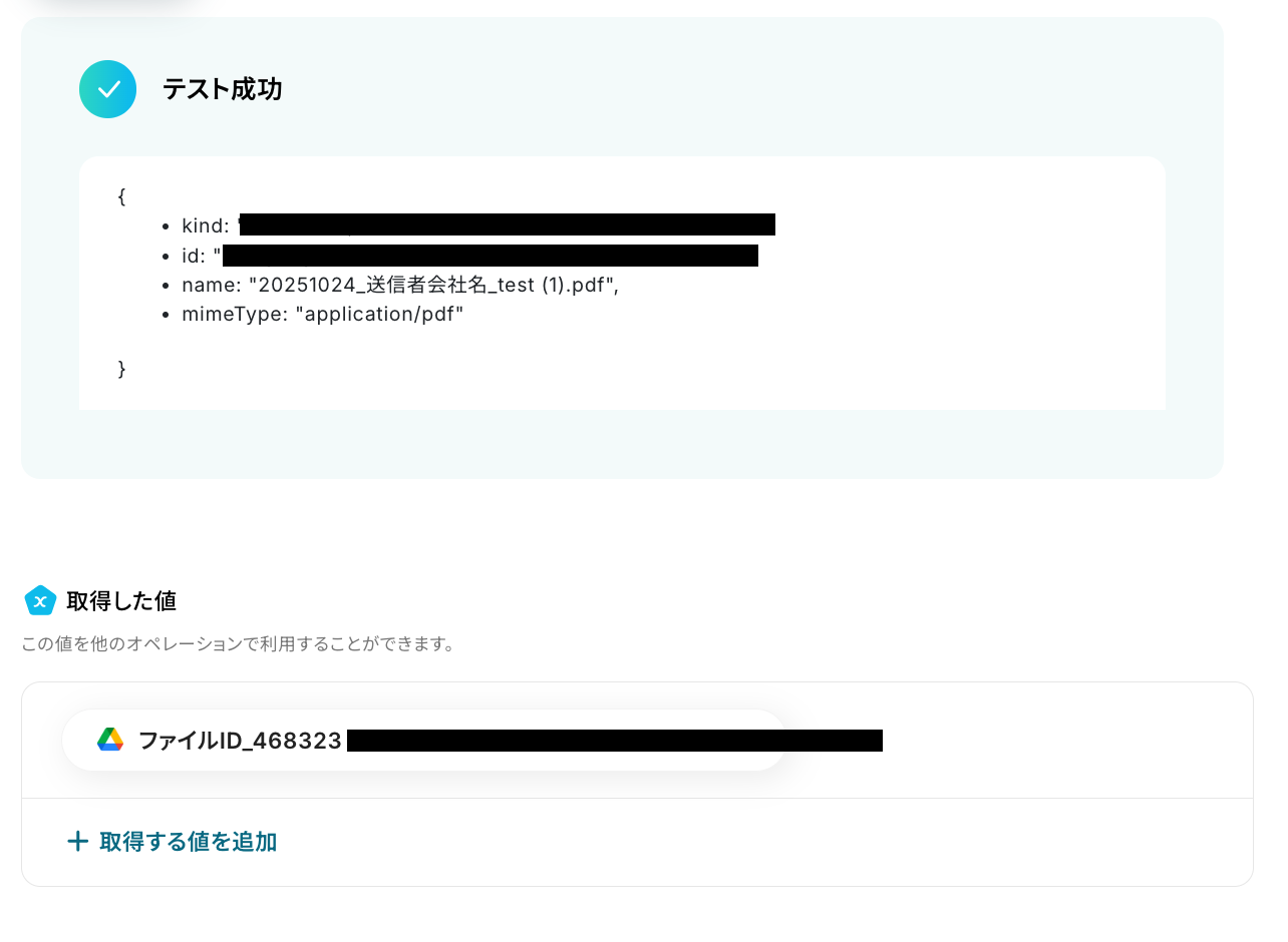 設定できたら「テスト」を行いましょう。テストに成功すると「取得した値」に反映されます。