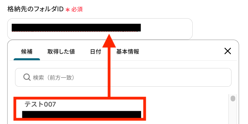 「格納先のフォルダID」を候補から選択しましょう。
