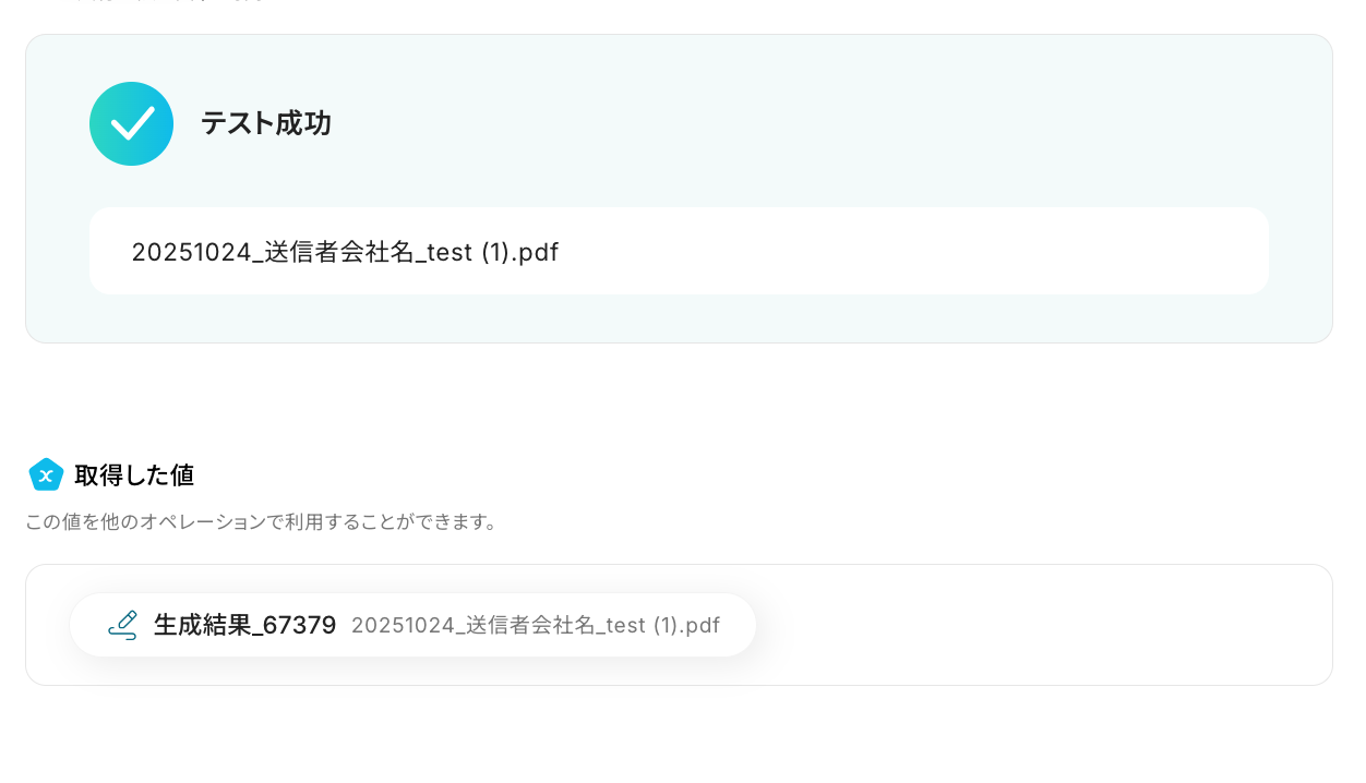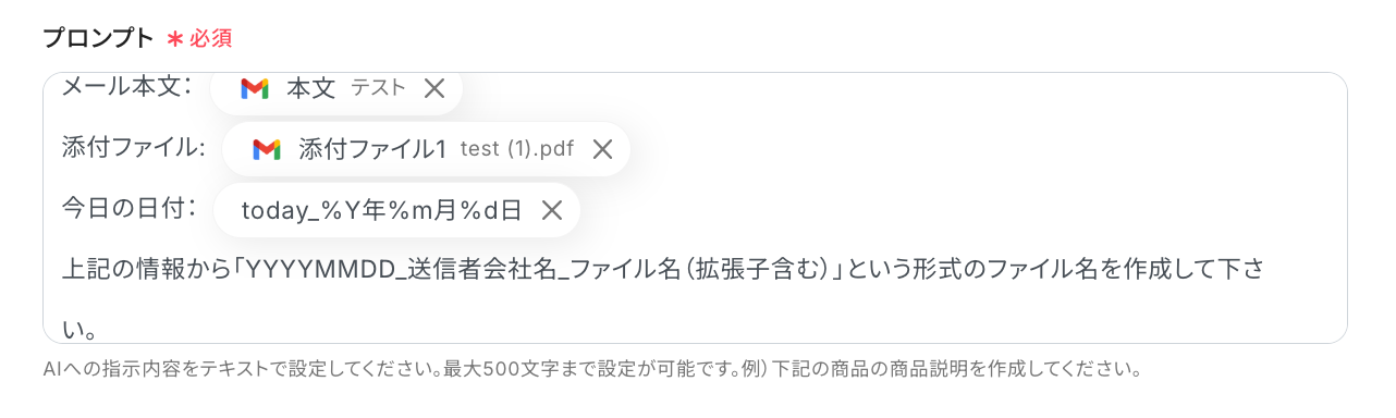 はい。可能です。実運用では「【請求書】A社_202407.pdf」のように、取引先名や受信月を含んだファイル名に変更できます。取得した値と入力する文字を組み合わせ、自由にファイル名を変更しましょう。