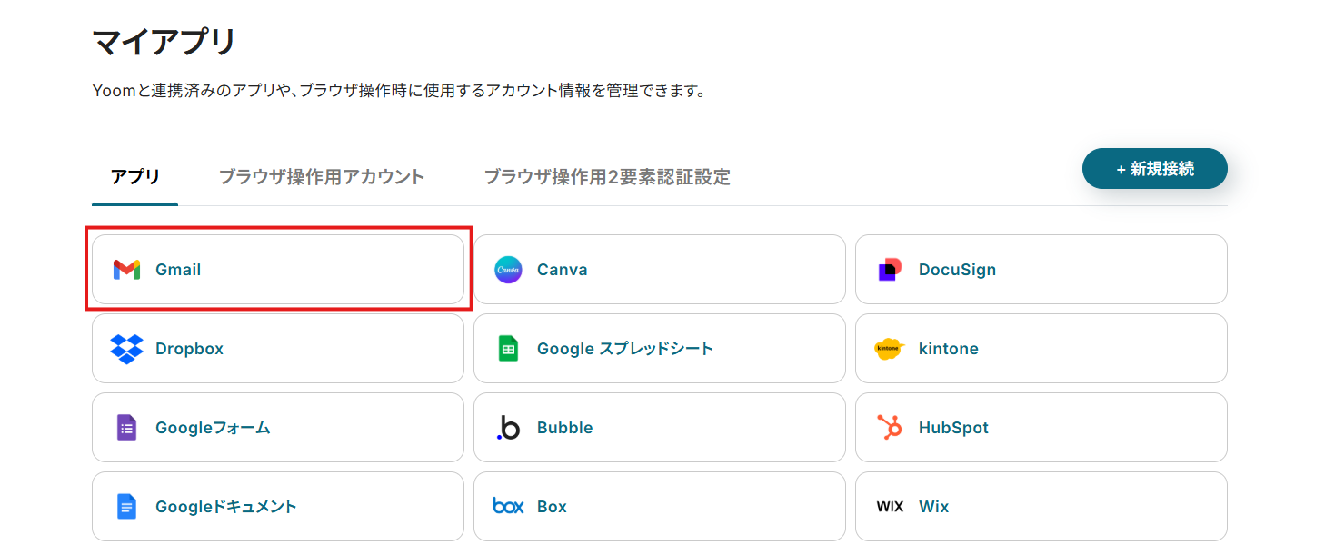 先ずは、Yoomと連携させたいCanvaアカウントとGmailアカウントを「マイアプリ」に登録しましょう。 この設定は初回のみ必要です。