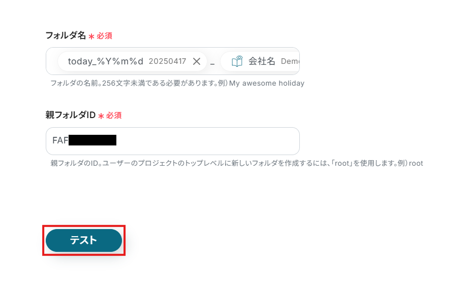 設定を終えたら、「テスト」をクリック。 ※ ここでは例として、フォルダ名には「{{フロー実行時の日付}}_{{会社名}}_{{姓}}{{名}}」、親フォルダIDには「Yoom連携用」というフォルダのIDを設定しました!