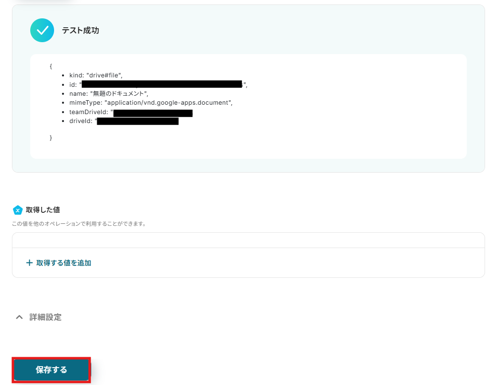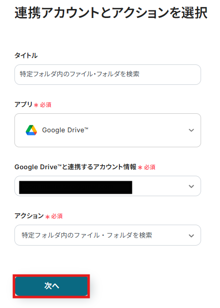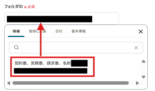 フォルダIDはボックスをクリックすると連携済みのIDが表示されるので、候補から選択してください。