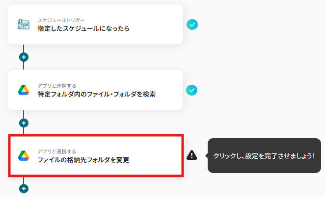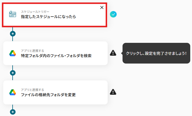 設定したスケジュール(例:「毎月末」「毎週金曜日」など)に合わせて、Google Drive内の特定のフォルダを自動で整理する自動化フローです。