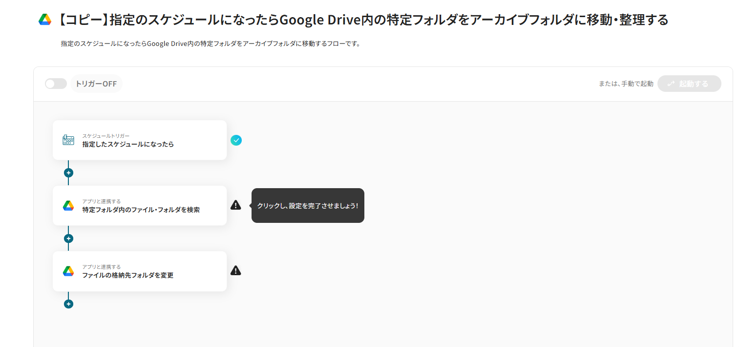 これで【指定のスケジュールになったらGoogle Drive内の特定フォルダをアーカイブフォルダに移動・整理する】というフローが完成です。
