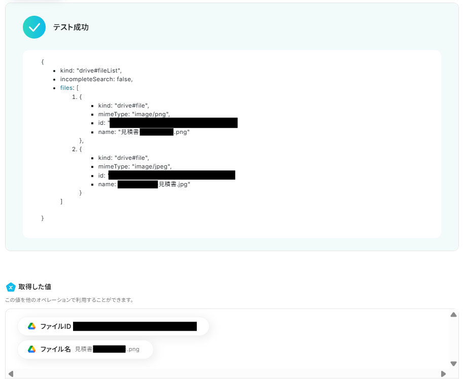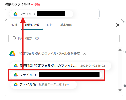 対象のファイルIDはアウトプットからファイルIDを選択して入力してください。