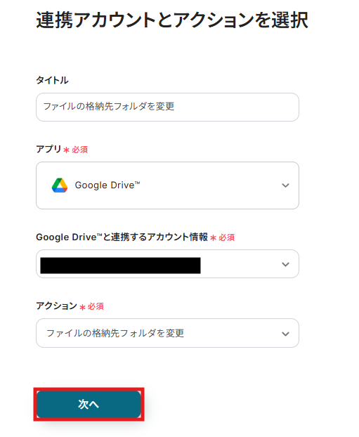 現在のフォルダIDや移動先のフォルダIDは先ほどのフォルダIDと同じようにボックスをクリックすると連携済みのIDが表示されるので候補から該当のIDを選択してください。