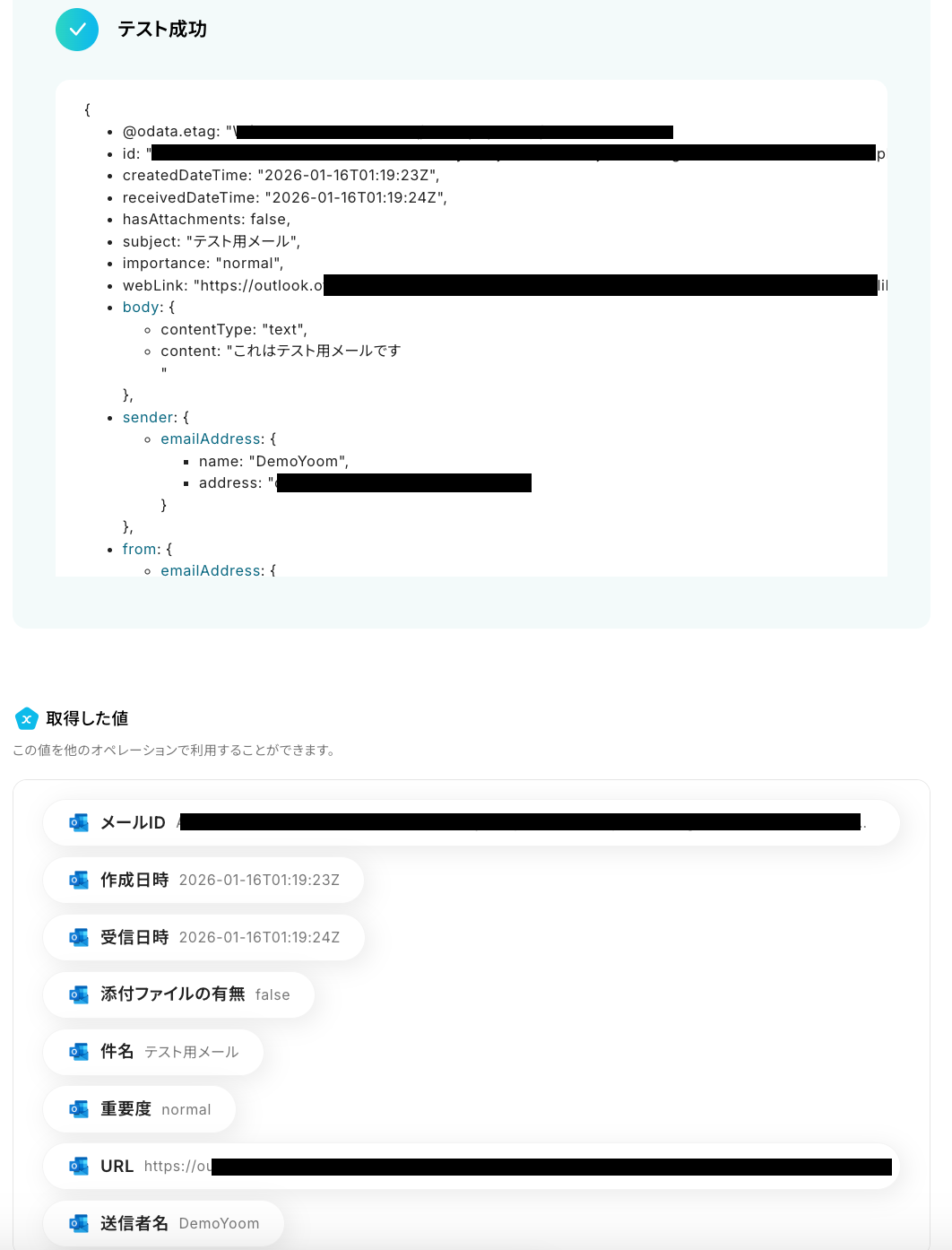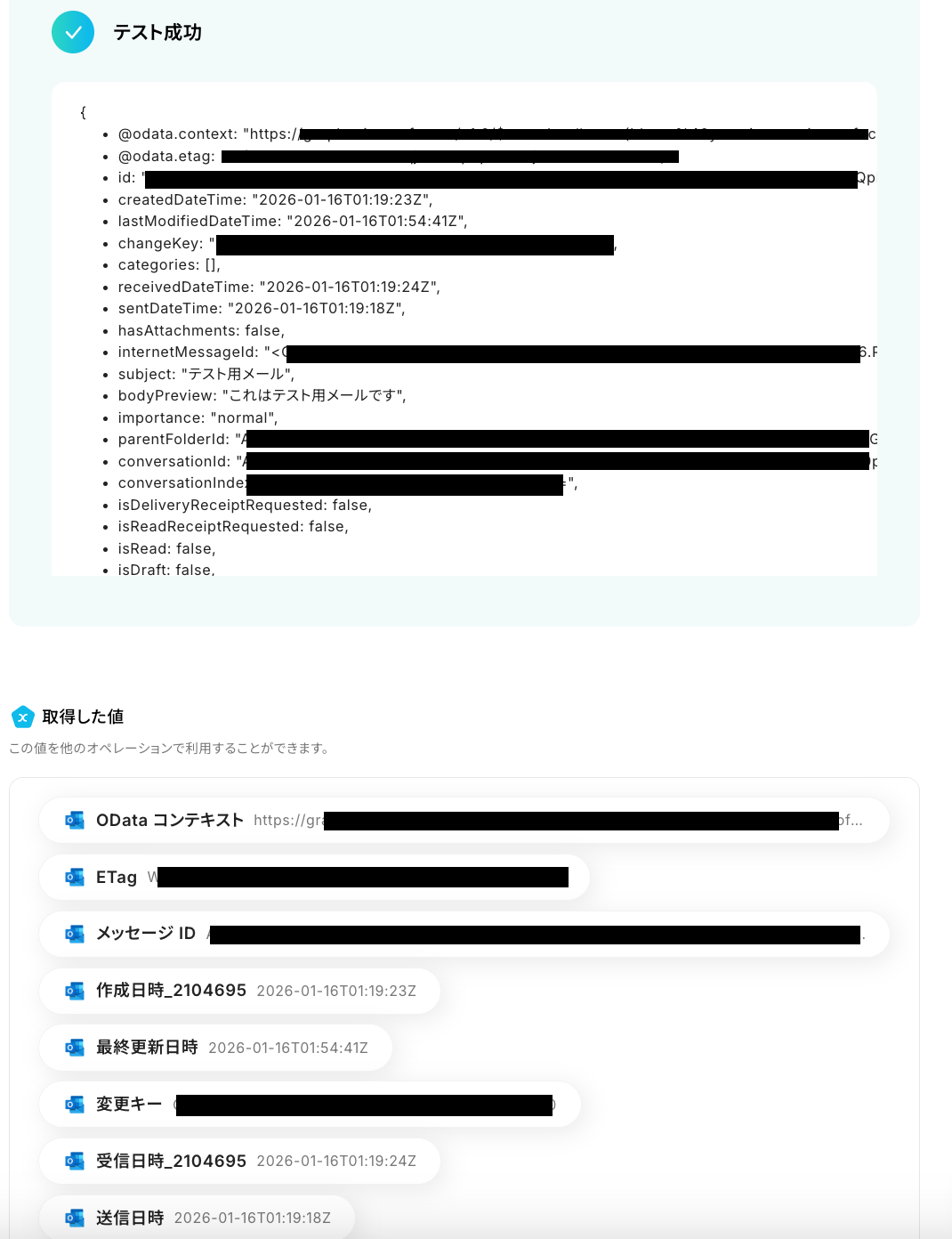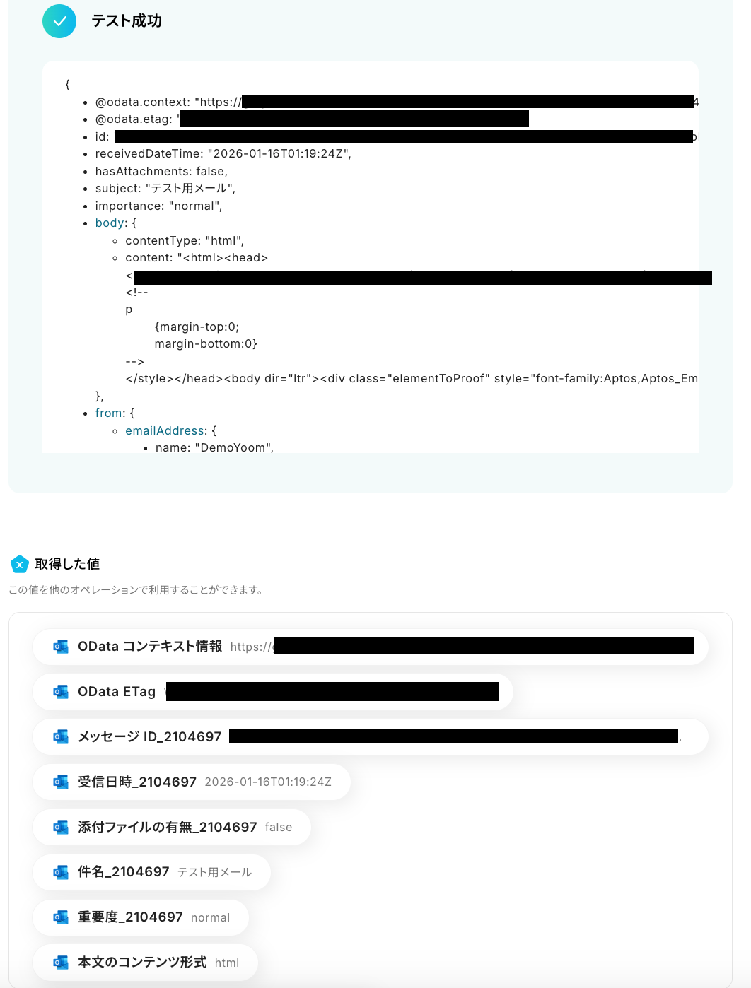 テストに成功すると、先ほどOutlookで受信した内容が取得した値に表示されます。