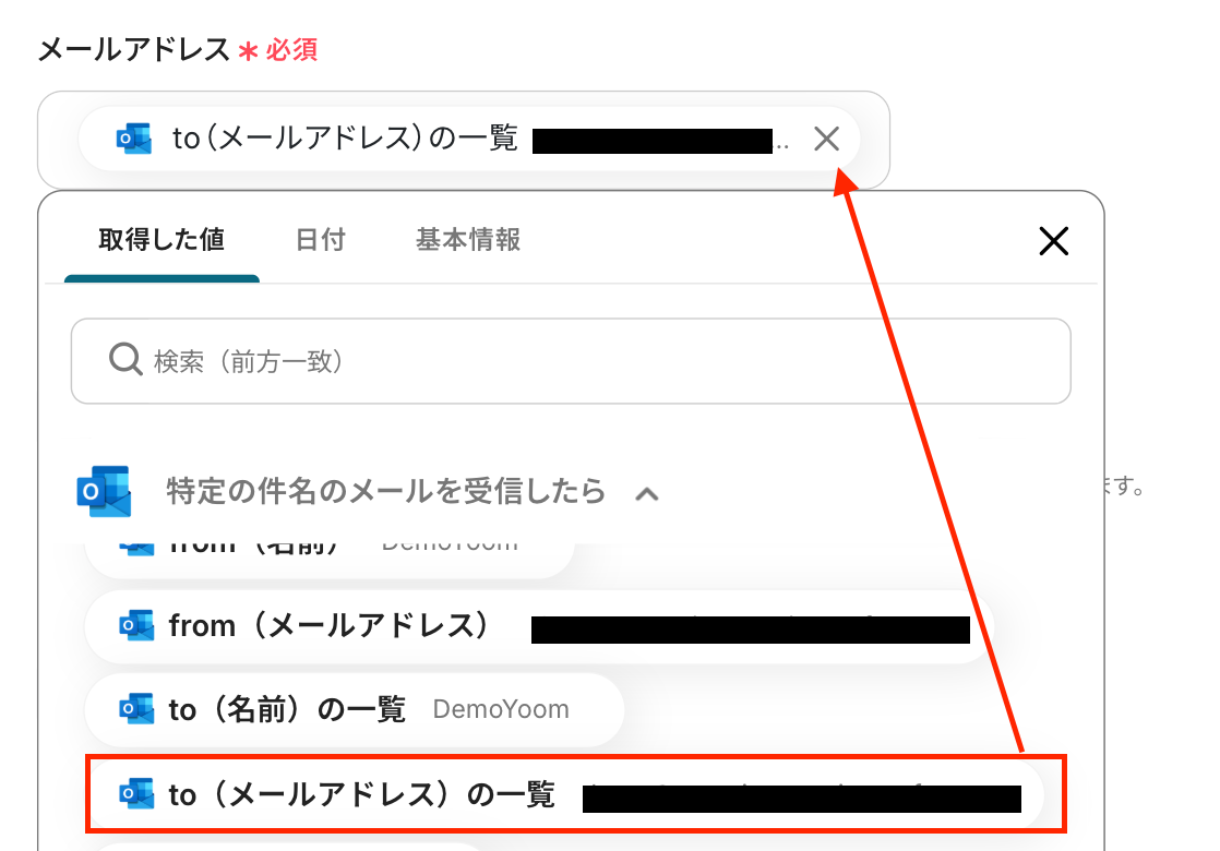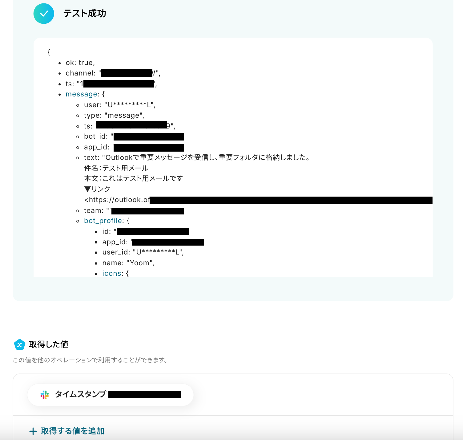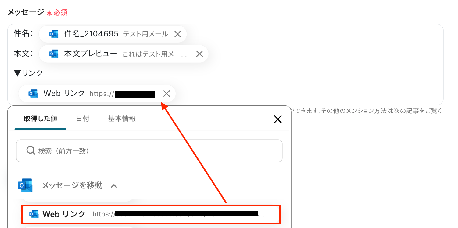 テストに成功すると、先ほどOutlookで受信した内容が取得した値に表示されます。
