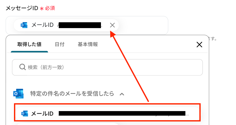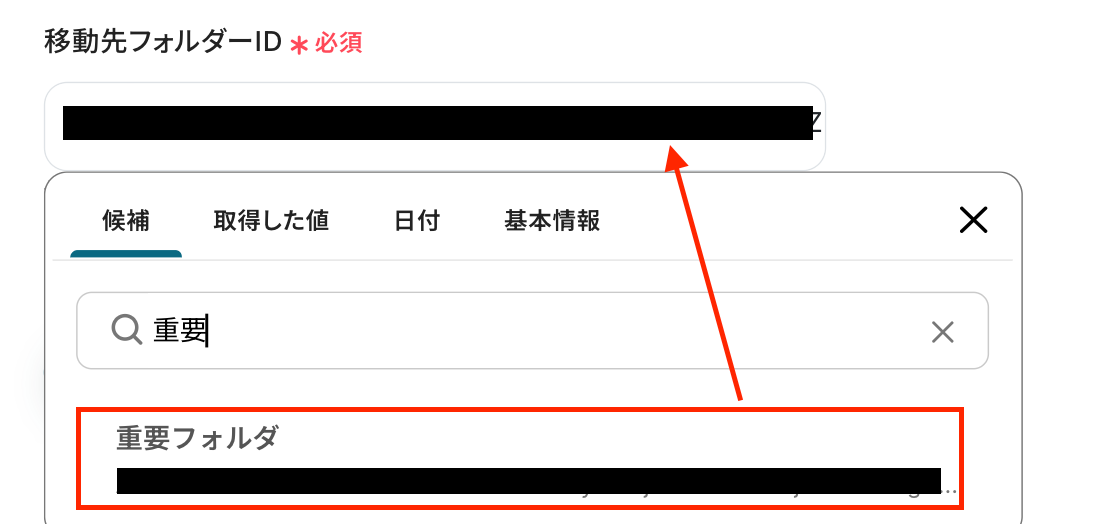 「メールフォルダID」:入力欄をクリックして表示される「候補」から選択します。