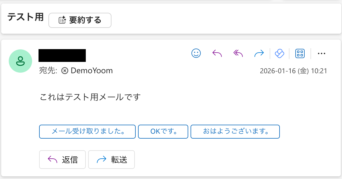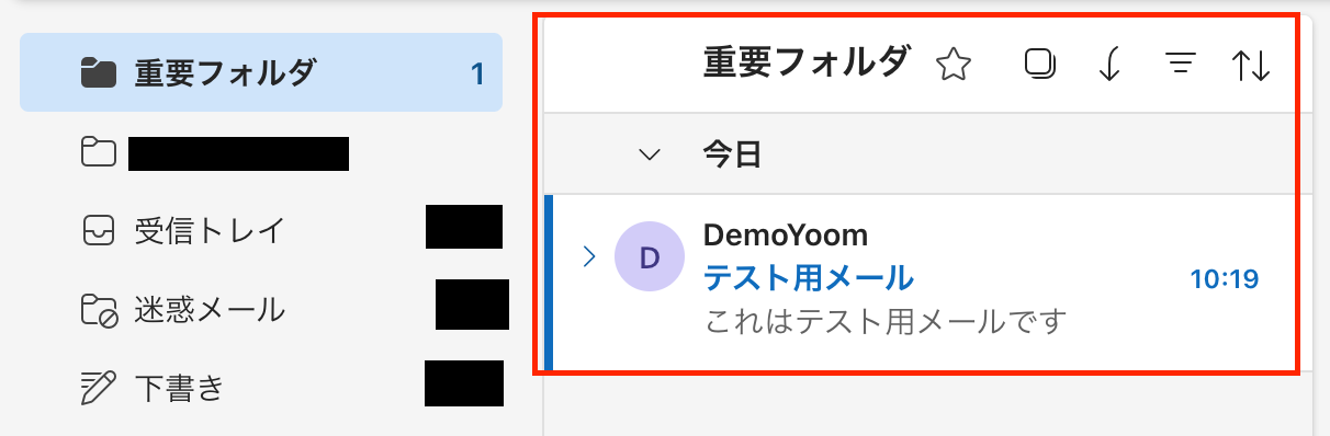 ここで、Outlookの画面に移動し、テスト用にメールを送信します。