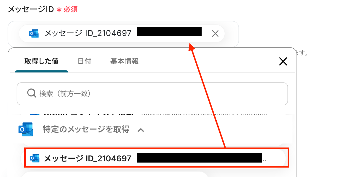- 次に、オペレーションでOutlookの「 特定のメッセージを取得 」を設定し、トリガーで受信したメールの詳細情報を取得します