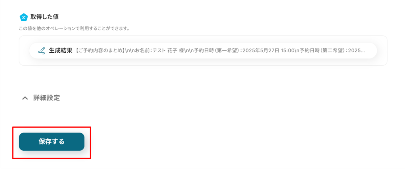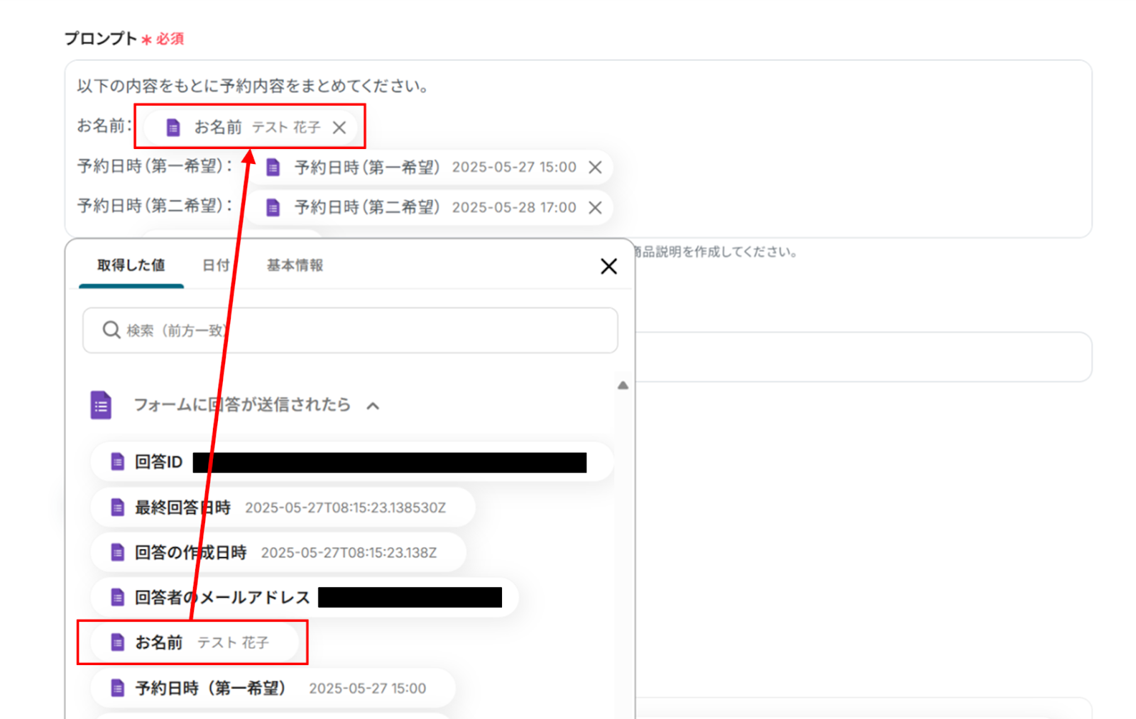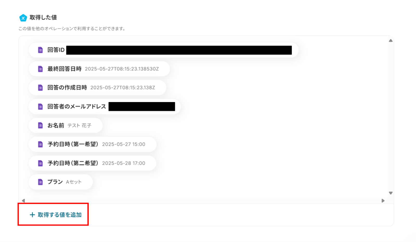 Google フォームの情報が「取得した値」に反映されればテスト成功です。