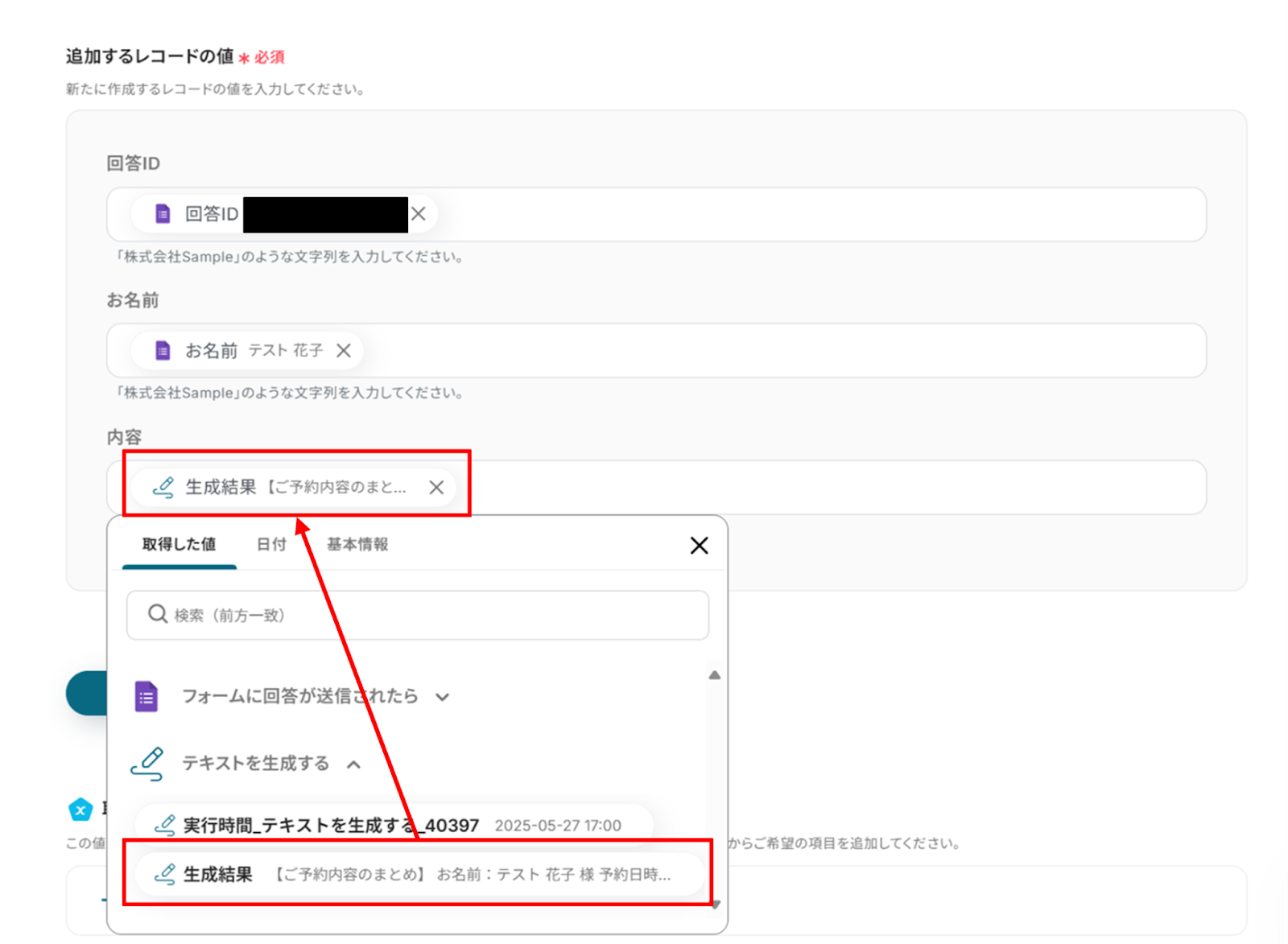 ここで先ほどAIが生成した内容を取得した値を使って入力しましょう!