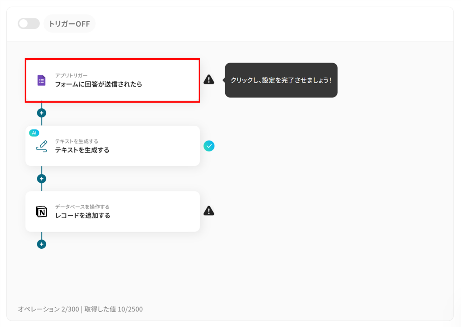 また、Google フォームをトリガーに設定した場合はテストが成功しても自動で質問内容が表示されない場合があります。