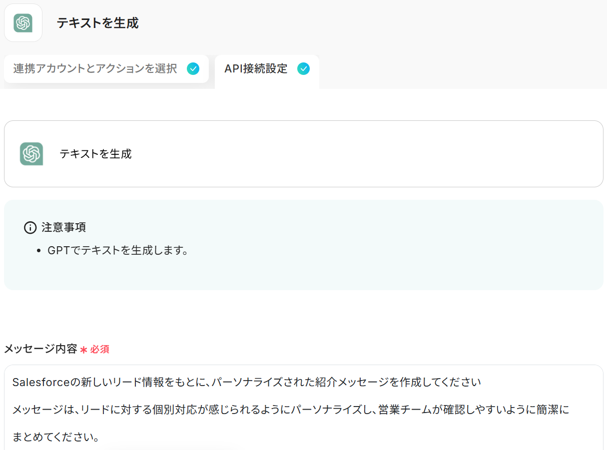 - 次に、オペレーションでChatGPTを選択し、「テキストを生成」アクションを設定し、Salesforceのリード情報を活用したメッセージを作成します