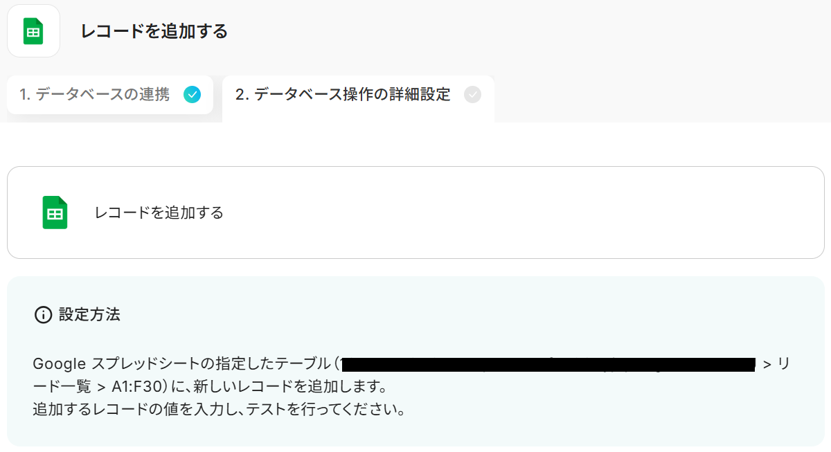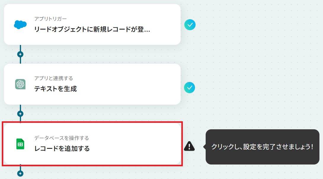 - 最後に、オペレーションでGoogle スプレッドシートを選択し、「レコードを追加する」アクションを設定し、リード情報と生成されたメッセージを指定のシートに追加します