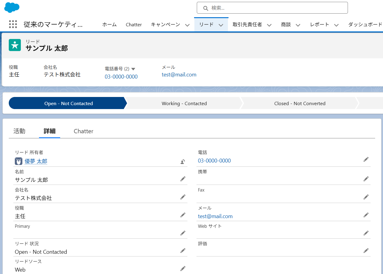 はじめにSalesforceでテスト用の新規リードを登録しましょう。