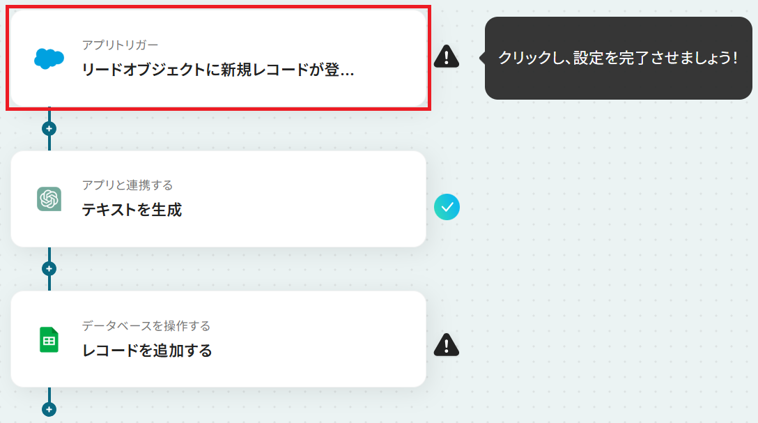 - Salesforceのトリガー設定、ChatGPTとGoogle スプレッドシートのアクション設定