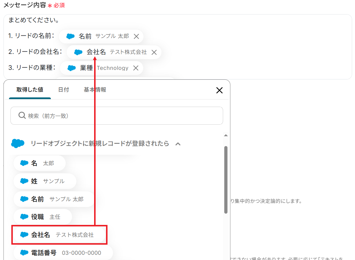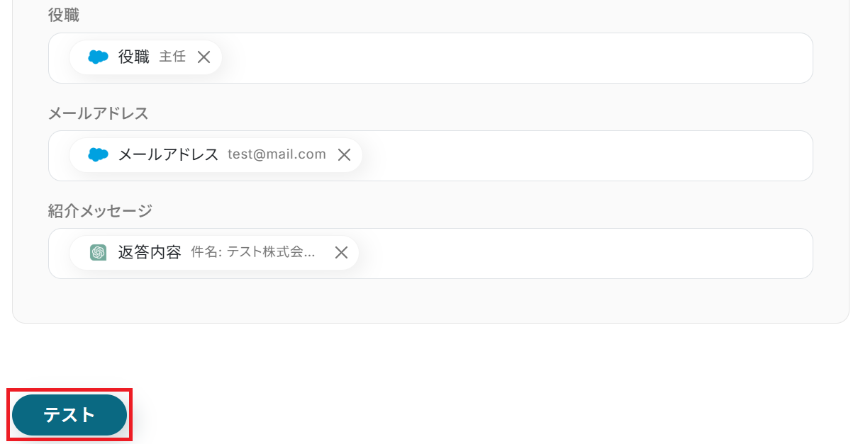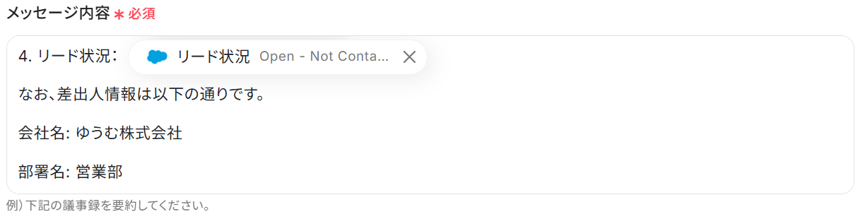 ステップ4と同様、Salesforce・ChatGPTから取得した値を選択することでリード情報や紹介メッセージを変数として反映させることができます。