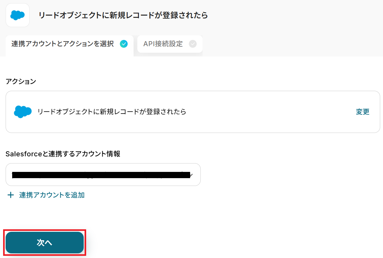 タイトルと連携するアカウント情報を任意で設定し、トリガーアクションはテンプレート通りに「リードオブジェクトに新規レコードが登録されたら」のまま「次へ」をクリックします。