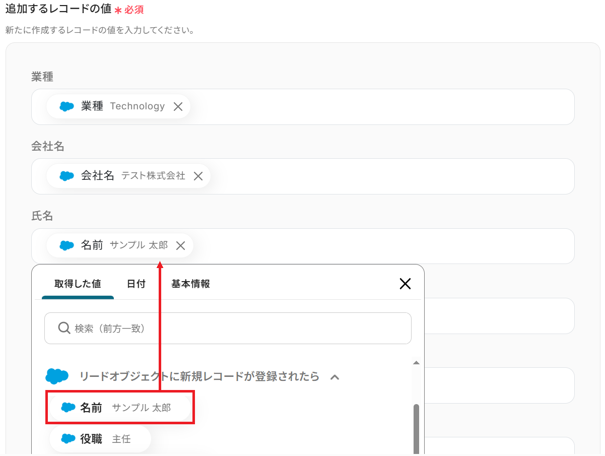 - Salesforceにレコードを追加する際、どの項目にどのデータを登録するかを自由に設定できます。OCR機能で抽出したテキストを変数として利用し、取引先名や担当者名などの適切な項目に自動で割り当てられます。