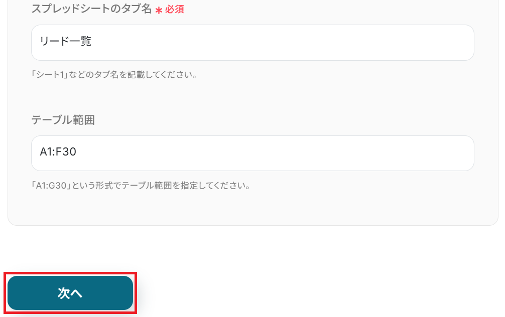 同様にスプレッドシートのタブ名も選択し、任意でテーブル範囲を選択して「次へ」をクリックします。