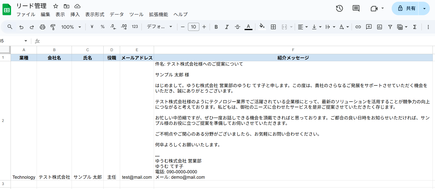 今回は例として、このリードをもとに紹介メッセージの文面を生成し、Google スプレッドシートにレコードを追加するという想定で進めていきます。