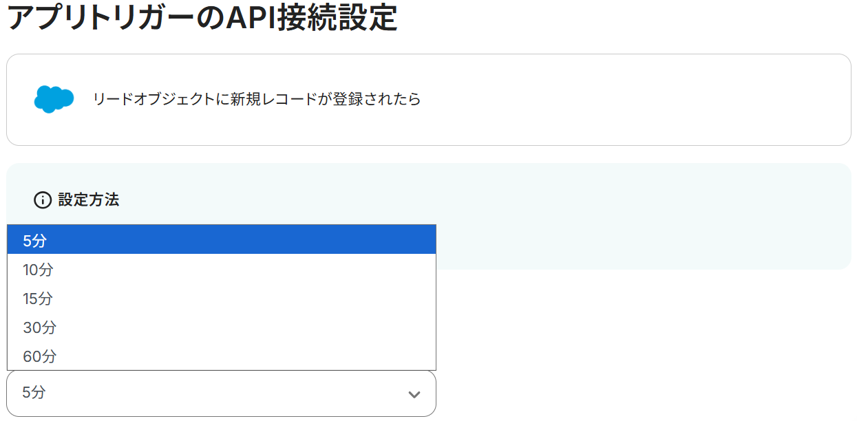 - 次に、トリガーでSalesforceを選択し、「リードオブジェクトに新規レコードが登録されたら」というアクションを設定します。