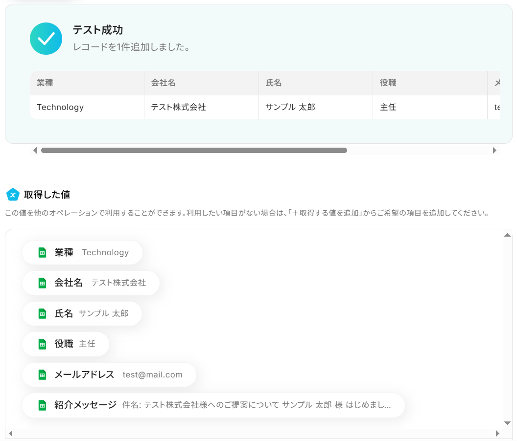 ステップ3・4で取得した情報を、Google スプレッドシートに自動で追記します。