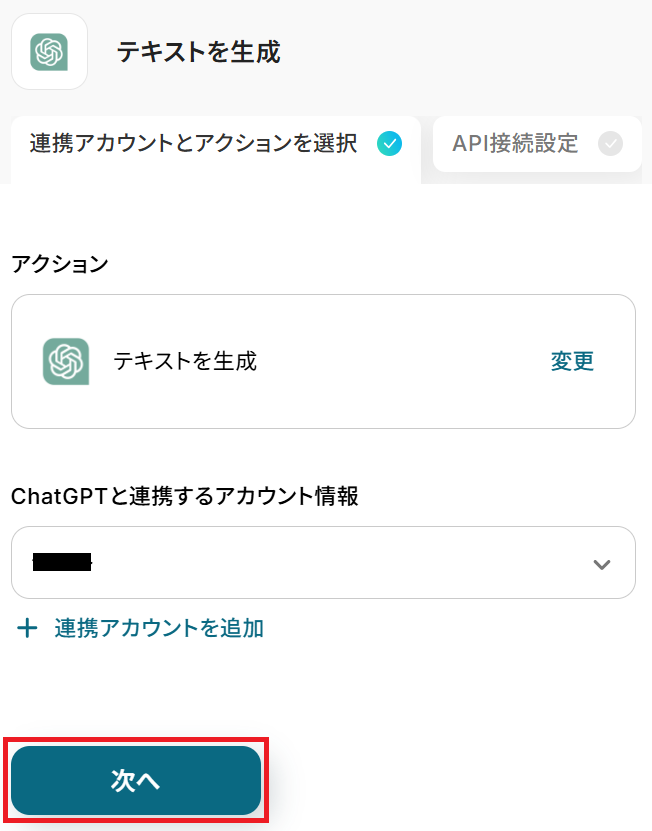 ステップ3と同様、アクションは「テキストを生成」のまま「次へ」をクリック。