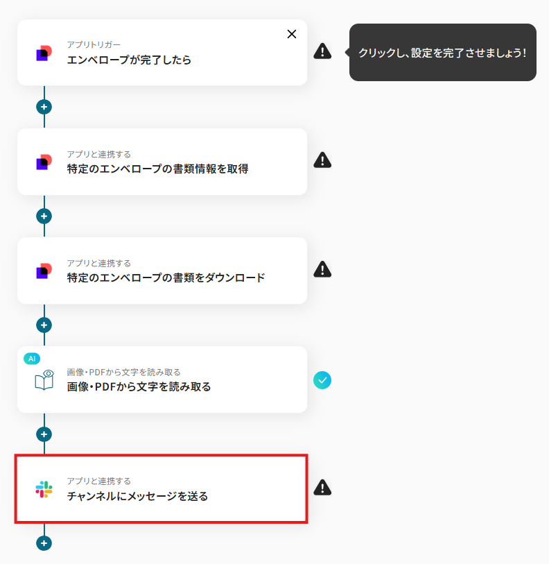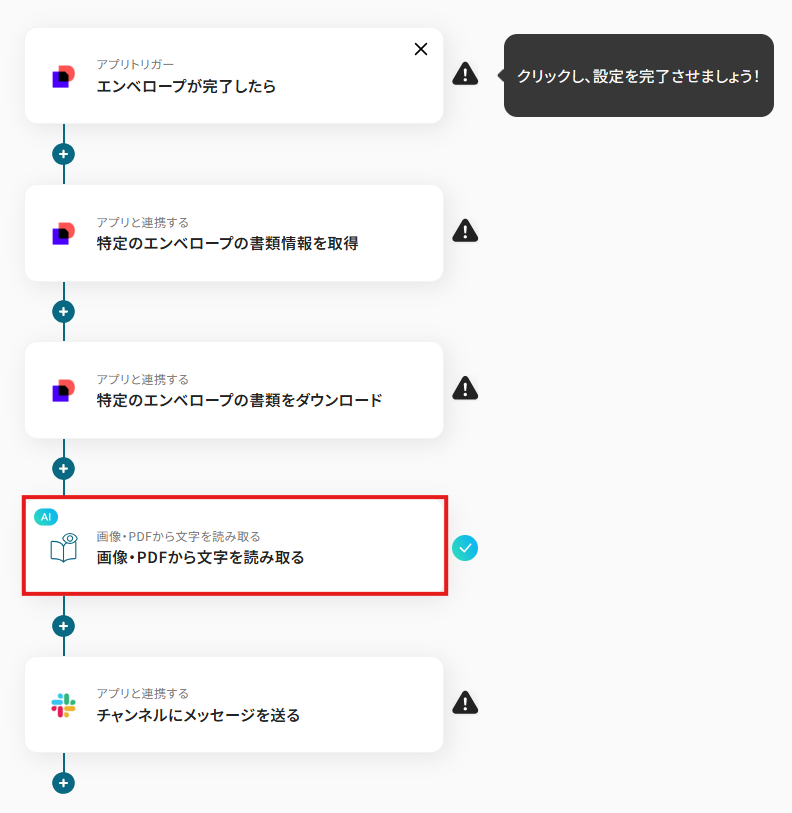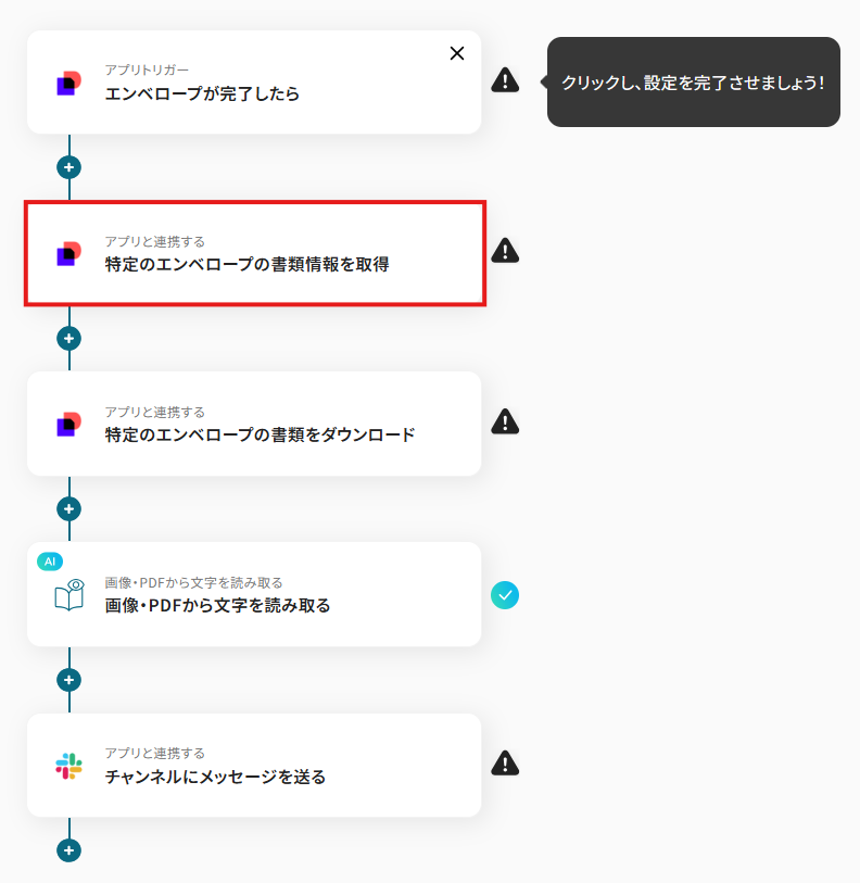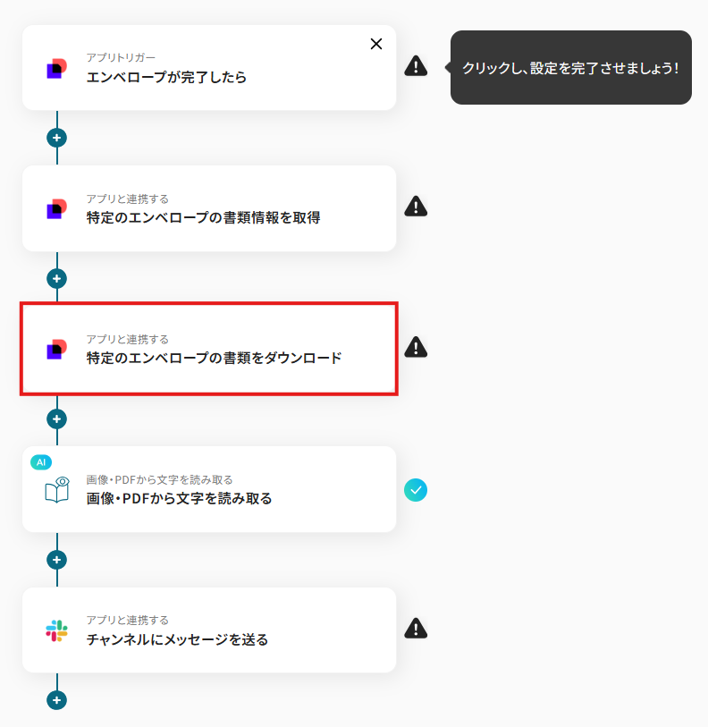 「DocuSignで契約が完了したら、書類をOCRで読み取りSlackに通知する」ワークフローを利用すると、契約完了後の手続きを自動化できます。