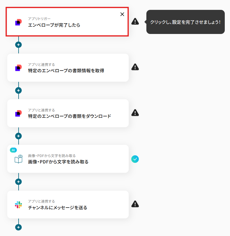 今回は例として、「DocuSignで契約が完了した際に、契約書類を自動でOCR処理し、その読み取り結果をSlackに通知する」フローの作成手順を解説します!