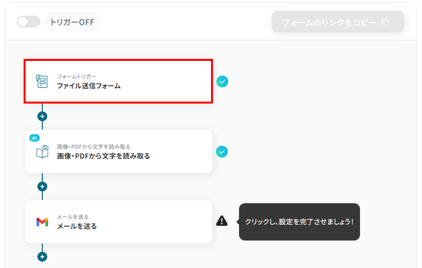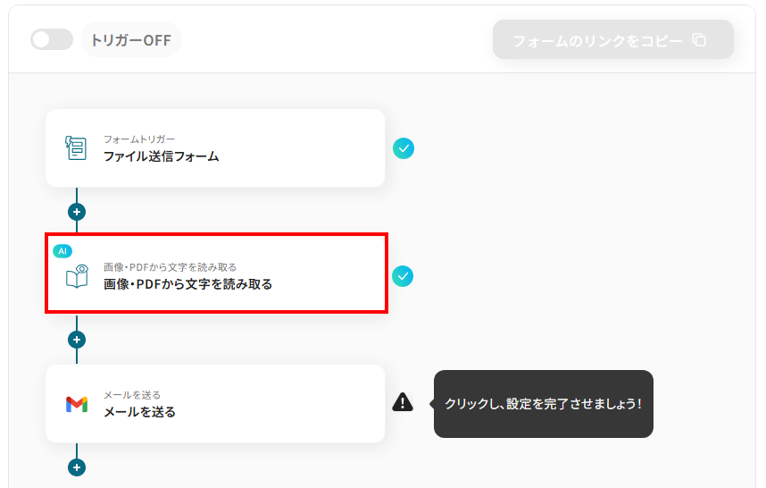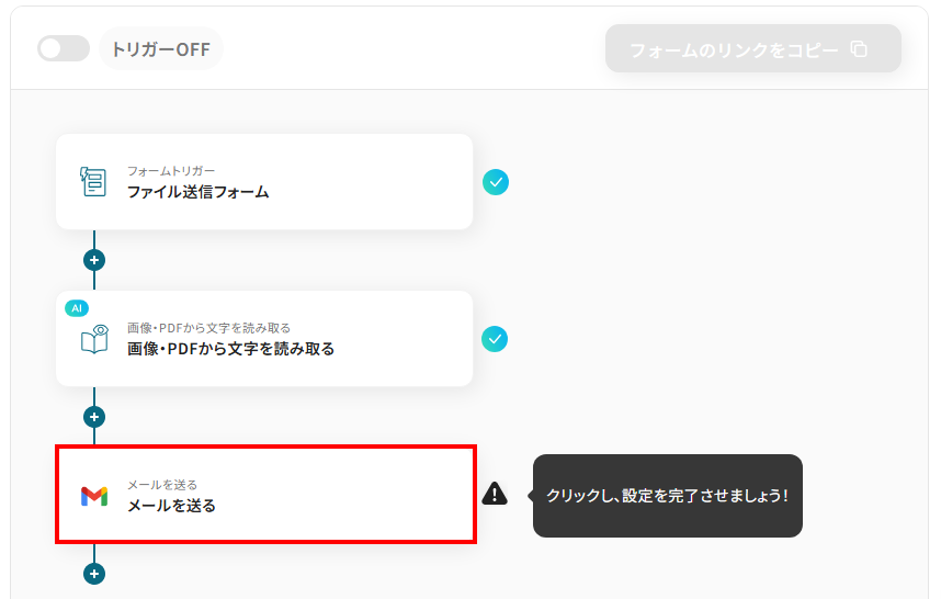 「フォームで送信された添付ファイルをOCRで読み取り、Gmailに通知する」ワークフローは、受信したファイルの自動処理と迅速な通知を実現します。