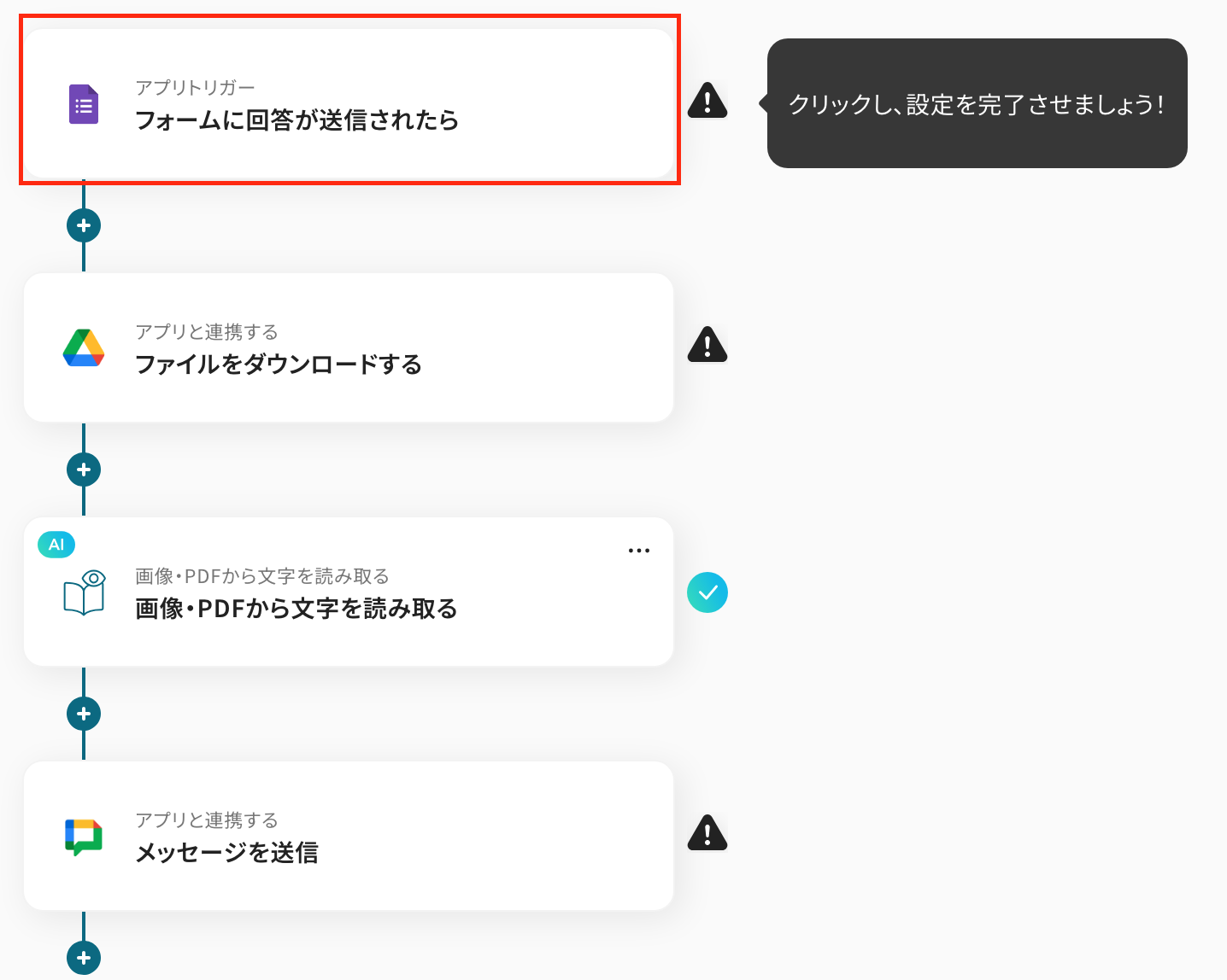 ここでは具体例として、代表的な自動化フローの一つである「Googleフォームから送信されたファイルをOCRで読み取り、Google Chatに通知する」設定手順の概要をご紹介しましょう。
