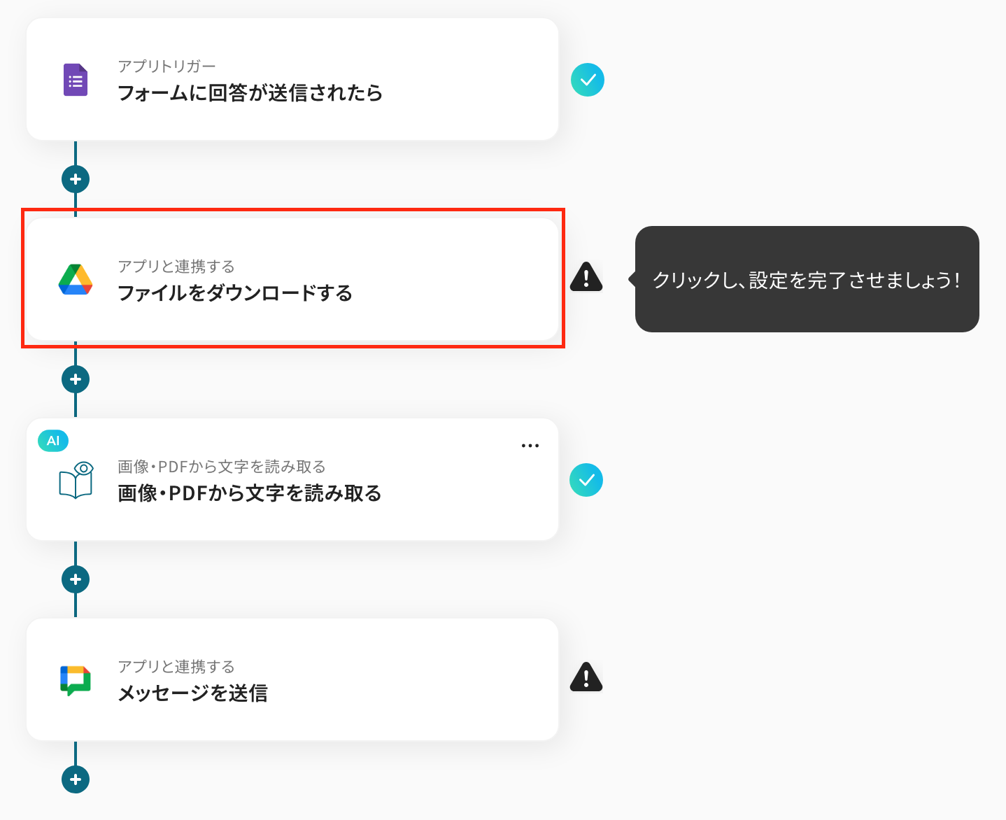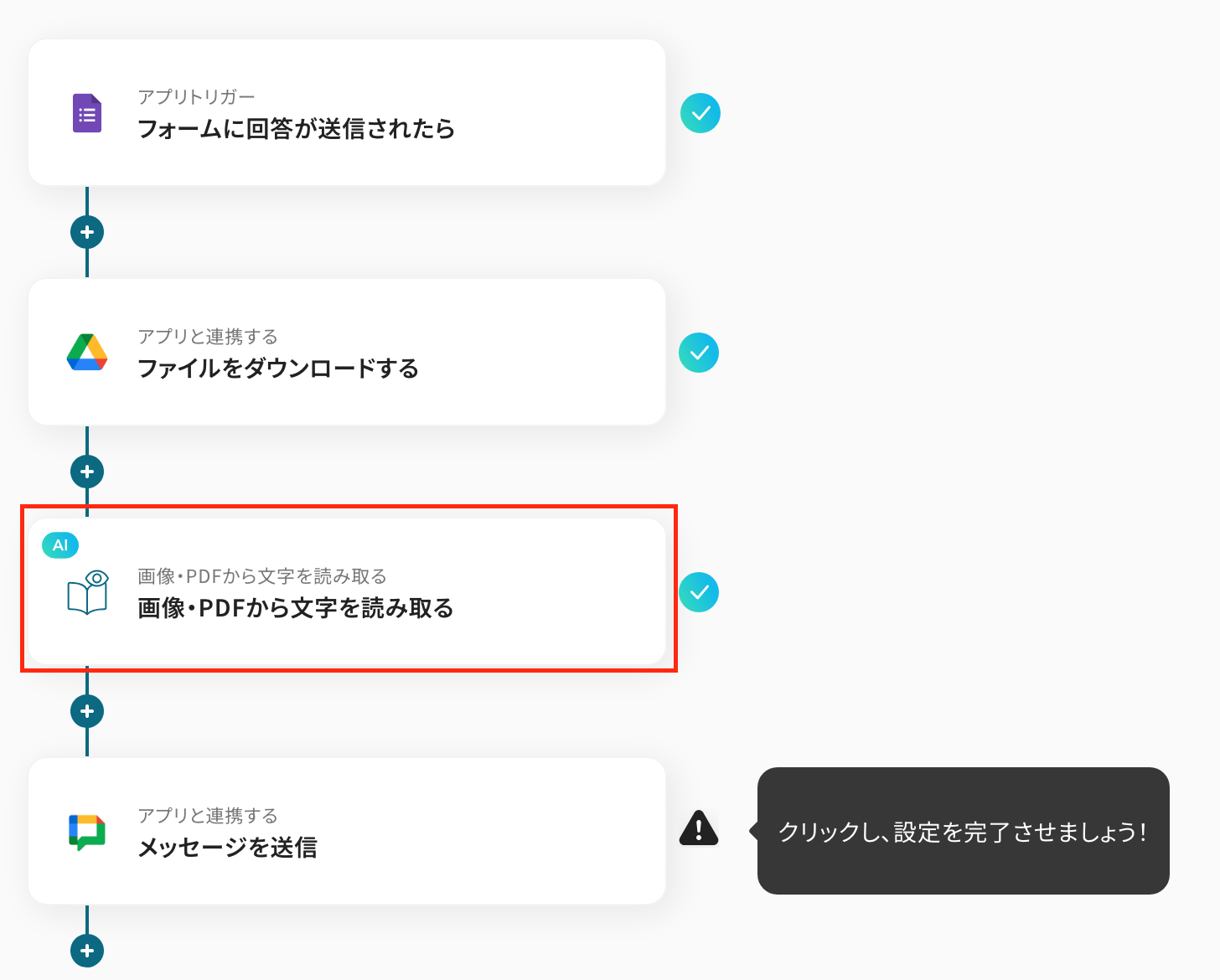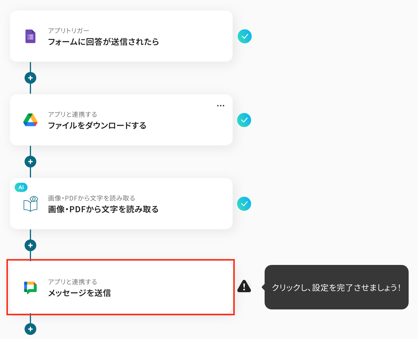 ここでは、OCRで読み取った情報をGoogle Chatに通知する設定を行います。以下の赤枠をクリックしましょう。